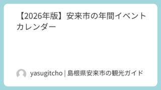 エンタメ【2026年版】安来市の年間イベントカレンダー こんにちは。今回は、安来市の恒例イベント・祭りのスケジュールをまとめていきます。安来市には四季折々の風景とともに、古くから大切に守られてきたお祭りや家族で楽しめるイベントも開催されています。「今月、安来で楽しそうなことやってないかな?」「せ... 2026.03.25エンタメ
